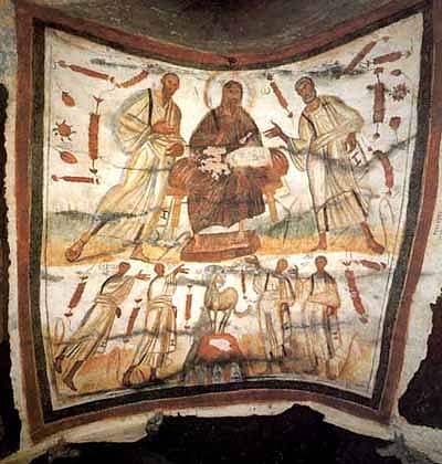 Gambar ini berasal dari abad ke-4, yang menggambarkan Yesus di antara St. Petrus dan St. Paulus. Gambar ini dilukis di dalam Katakombe St. Marcellinus dan Petrus di Via Labicana di Roma, terletak di sebuah vila yang dulunya milik Kaisar Kontantinus. Di bawah gambar utama dari lukisan itu, kita bisa melihat empat tokoh yang menjadi martir yang dimakamkan di dalam katakombe itu, mereka adalah Gorgonius, Petrus, Marcellinus dan Tiburtius. Mereka digambarkan mengarahkan tangan mereka kepada Anak Domba Allah di altar surgawi-Nya.