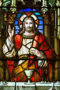 Jesus Christ at a table with chalice and holding bread Stained glass at Calgary Alberta Canada by Posterazzi (Sumber: amazon.com)