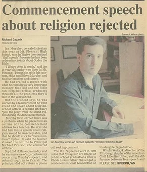 Pelayanan ini sampai pada titik puncak pada tahun 1993, ketika saya berada di SMA, dan saya dinobatkan sebagai pembawa pidato perpisahan. Ketika saya ditanya apa yang ingin saya sampaikan pada pidato pembukaan saya, maka tidak ada keraguan. Saya ingin memberi tahu teman-teman sekalas saya tentang Yesus. Namun, setelah membaca proposal pidato saya, penasihat kelulusan memberi tahu saya bahwa saya tidak diperbolehkan menyebut nama Yesus pada waktu wisuda. Saya menjelaskan dengan penuh hormat bahwa kami tinggal di negara yang bebas, di mana Deklarasi Hak-Hak (Bill of Rights) melindungi kebebasan beragama dan berbicara. Saya menjelaskan kepada ibu penasihat bahwa saya bebas mengatakan apa yang saya imani begitu juga dengan para hadirin yang bebas untuk tidak sependapat dengan saya, dan kebebasan yang mahal harganya ini membuat bangsa ini hebat. Penasihat pidato kembali menjawab bahwa saya tidak diperbolehkan untuk menyampaikan pidato saya, dan ibu penasihat sendiri akan mencabut sendiri kabel sound system jika saya menyebut nama Yesus ketika wisuda.